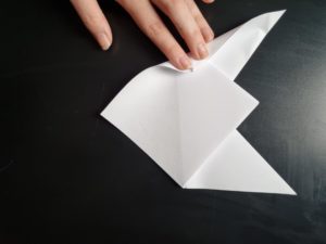 - Pak nu de twee buitenste punten en vouw ze beiden naar het midden zoals je hier kunt zien.