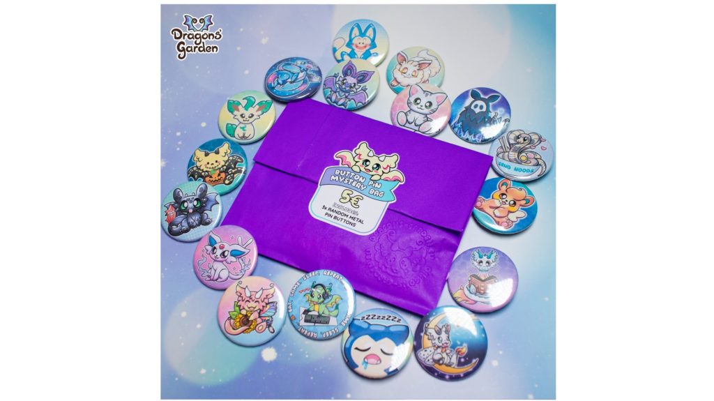 Pin buttons in many colours with fanart and original designs. They also come as mystery packets if you are unable to choose.